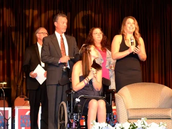 As is the case every year, the highlight of the evening was meeting two of the young people who benefit from our MAT Program. Seven-year-old Amerlyn, whom we fly to St. Louis Shriners for treatment of her prosthetic leg, charmed the crowd during her interview with Wings of Hope board member, Fred Meyland-Smith. And there was nary a dry eye in the room when Emilee Williams, a young woman who had lost the ability to walk but has been quickly recuperating thanks to the support of Wings of Hope, joined her father for the evening’s first dance to “Fight Song,” by Rachel Platt.