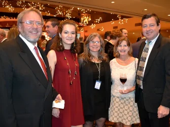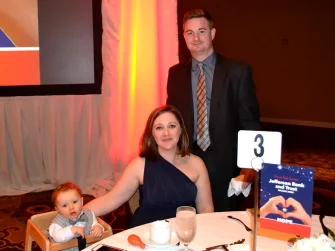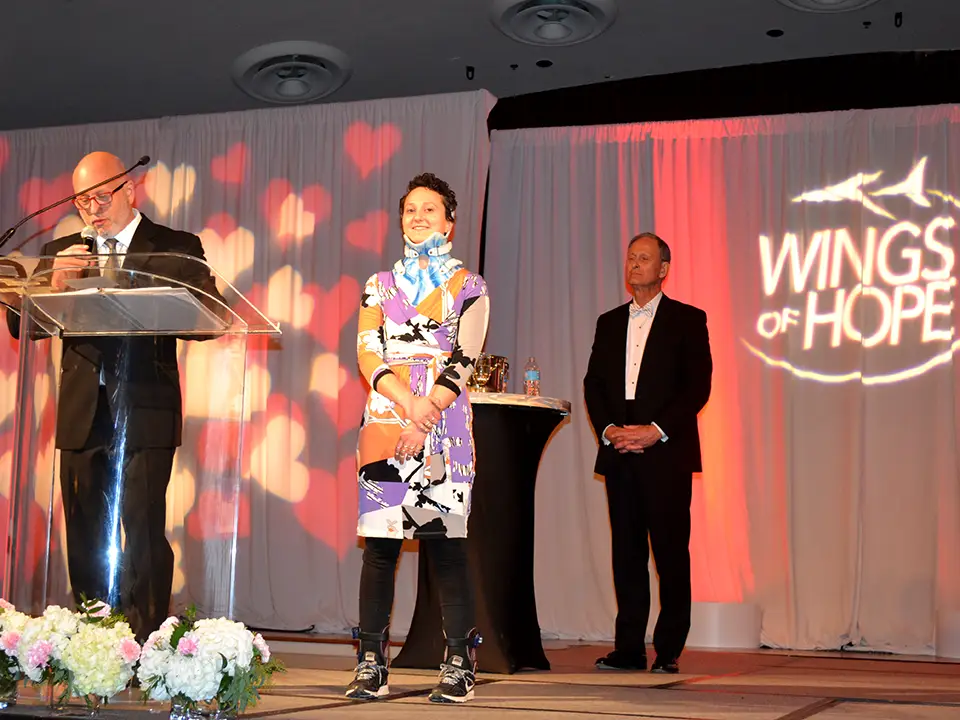 Guests were visibly moved as patients took the stage to share their stories of how Wings of Hope has made their journeys back to health possible. The families of two baby boys with clubfeet talked about how Wings of Hope made it possible for their sons to be treated by St. Louis Children’s Dr. Matthew Dobbs, a nationally renowned expert on the Ponseti method of treating clubfeet. Emilee Williams, a young woman who brought the crowd to tears at last year’s gala when she got out of her wheelchair to dance with her dad, returned to update guests on her ongoing recovery from Wilson’s disease. Williams and her sister then presented Meyland-Smith with a check for $750 – part of the proceeds from a walk they organized last fall to raise funds for research into a cure for Wilson’s disease. Finally, Jonathan Raskas and his daughter, Jasmine, shared their gratitude for Wings of Hope’s role in transporting Jasmine to the Mayo Clinic for treatment of Ehlers Danlos Syndrome. Jonathan talked about his unique perspective as a former MAT pilot – who had flown dozens of patients in Wings of Hope’s planes – riding as a passenger with his daughter on her flight to treatment.