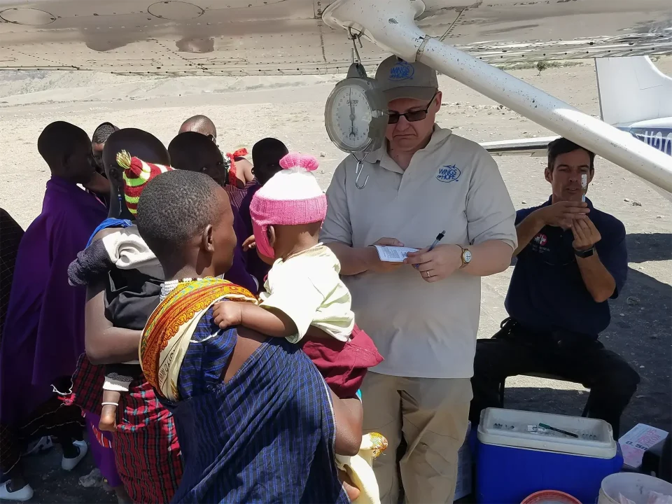 When Wings of Hope President and CEO Bret Heinrich visited Tanzania this past June, he was able to join our longtime partner Flying Medical Service (FMS) on their fly-in medical clinics serving Maasai women and children. FMS flies doctors into 25 Maasai communities, visiting each settlement every two weeks to provide pre- and post-natal care for mothers and vaccinations for babies. They also weigh the babies, using a scale hanging from a plane wing, to make sure they are gaining sufficient weight through nursing. Mothers of underweight babies are given a mixture of powder and vitamins that they can make into a drink for their babies called “Plumpy.” Wings of Hope mechanic, Bill Patterson, joined Bret on the trip to perform an annual inspection on the FMS plane.