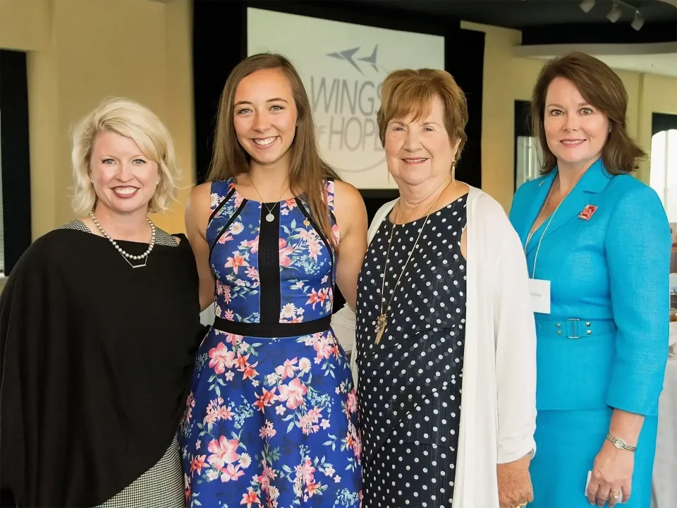 The ladies of Wings of Hope gathered at the Chase Park Plaza for their annual luncheon on June 6. Wings of Hope Board member and Executive Director of St. Louis Children’s Hospital Shelley Perulfi was the featured speaker. Shelley shared a wonderful story of Isaac, a young patient Wings of Hope flies to St. Louis for treatment at Children’s Hospital – showing in very human terms how Wings of Hope’s partnership with St. Louis Children’s is making a powerful difference in the lives of children and families. Connecting the generations, Emily Mueth – a recent St. Louis University School of Nursing graduate and grand-daughter of longtime Wings of Hope supporter Joan Mueth – introduced Shelley who also started her career as a nurse. In addition to a socializing, lunch and presentations, guests enjoyed choosing among the many scarves provided as table gifts which has become a Ladies Luncheon highlight and tradition.