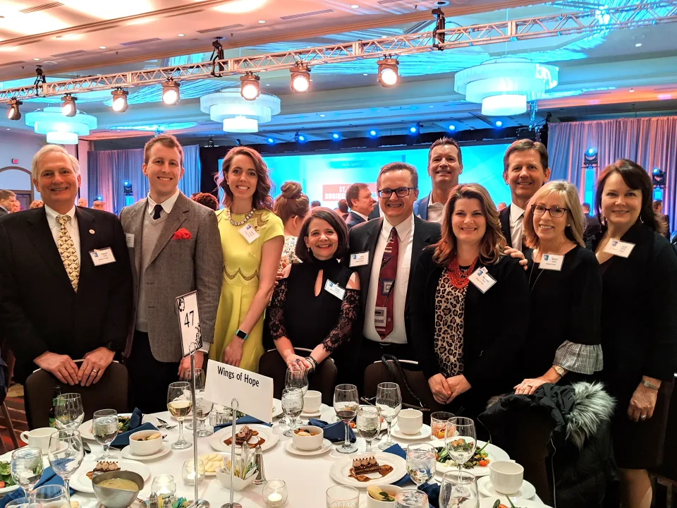 When Wings of Hope learned we had made the cut as a finalist in the St. Louis Regional Chamber’s Arcus Awards – which recognizes organizations that make St. Louis a great place to live, work and invest – we had no idea we would walk away with the People’s Choice Award. All finalists had a chance to win by garnering the most online votes for their organization during the weeks leading up to the awards ceremony. We knew our enthusiastic cadre of supporters would put us in the running, but we were up against some large and popular contenders. Live voting continued during the event – and it was a nail-biter at the Wings of Hope table. When Wings of Hope was announced as the winner, the table erupted in applause and our President and CEO practically ran up to the stage to accept the honor. When the Chamber’s Judy Schrum stopped by our hangar to present us the award a few weeks later, she let us in on a secret: Wings of Hope was so far ahead of the other finalists before the event that the live voting didn’t matter. We are so grateful to the St. Louis Regional Chamber for being a great civic partner – and proud of our Wings of Hope family for, once again, showing how much they care!