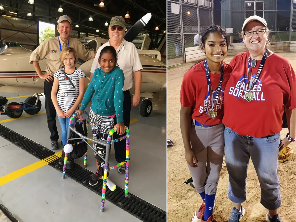 PHOTOS: (left) Gracin in October 2017: her first Wings of Hope flight. (right) Gracin in July 2021 after pitching six innings and leading her softball team to the league championship.