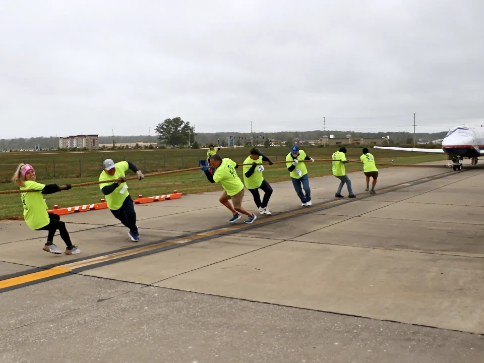 Wings of Hope’s inaugural Pulling for Hope fundraiser took place on October 14 — a windy Saturday that started off rainy — on the tarmac outside the Wings of Hope hangar. But the chilly conditions couldn’t cool the enthusiasm of the eight teams participating in the organization’s first-ever plane pull: Team Fabick Cat, Board Plane Pullers (Wings of Hope Board of Directors), AVMATS Afterburners, Heirloom Wealth Partners, Husch Blackwell Law Firm, Wing Dings, Secure Data Technologies, and UHY Advisors & ADB Companies.