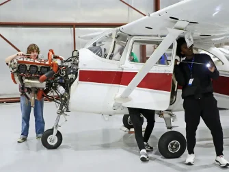 Hands-on activities include building gliders (not the dime-store version), practicing communicating with air traffic control during a simulated exercise that mirrors airport traffic patterns, installing an electrical system on a foam aircraft, and working with aircraft mechanics on some of the essential skills used in maintaining planes. Student teams also participated in an engineering project — designing and building a working catapult for competition at the end of the session — and practiced flying drones.